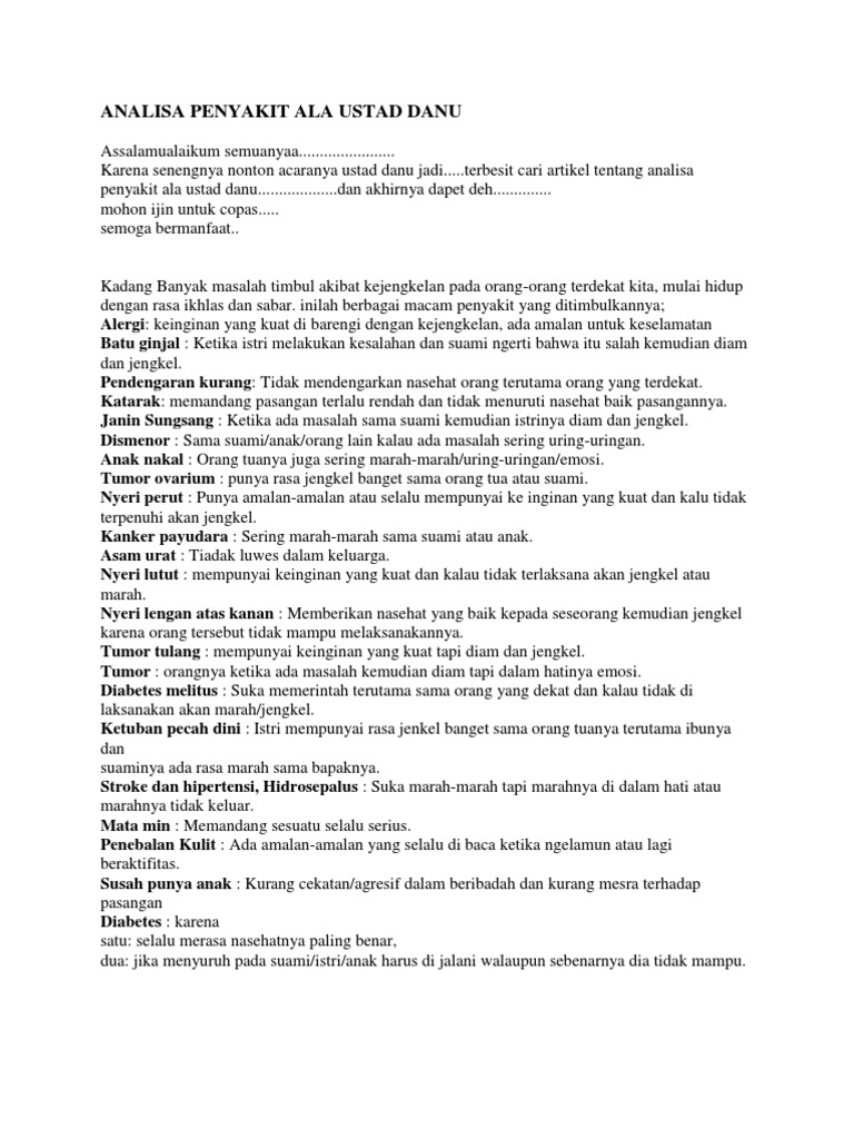 Kaki kanannya sering kaku dan sakit.menurut mas danu hal itu disebabkan masalah komunikasi dengan keluarga. Asam lambung terjadi karena salah makan dan kelelahan fisik. Pilihan obat asam lambung yang ada. Sakit asam lambung bisa terjadi karena katup antara kerongkongan dan lambung tidak berfungsi dengan baik, sehingga menyebabkan asam lambung. Ini dia contoh pengobatan yang bisa dilakukan untuk mengobati dan penanganan lanjut asam lambung. Asam lambung menurut ustad danu. Siraman qolbu ustad dhanu !!! Penyakit asam lambung (gerd) pada umumnya disebabkan oleh tidak berfungsinya lower esophageal sphinchter (les), yaitu lingkaran otot pada bagian bawah dari kerongkongan. Gejala penyakit ini sering diduga sebagai serangan jantung atau penyakit jantung koroner, karena gejalanya yang hampir mirip dengan nyeri dada. Makanan untuk menurunkan asam lambung. Asam lambung adalah asam hidroklorida yang terdapat di lambung dimana asam tersebut berfungsi memecah makanan dan melindungi tubuh dari infeksi bakteri. Bila anda memiliki masalah maag dan penyakit asam lambung, sebaiknya hindari. Menurut ustad danu, pada prinsipnya semua penyakit muncul akibat seseorang sering mengumbar hawa nafsu sehingga allah menurunkan azab atau peringatan agar manusia kembali ke jalan yang benar yaitu alquran dan sunah rasul.