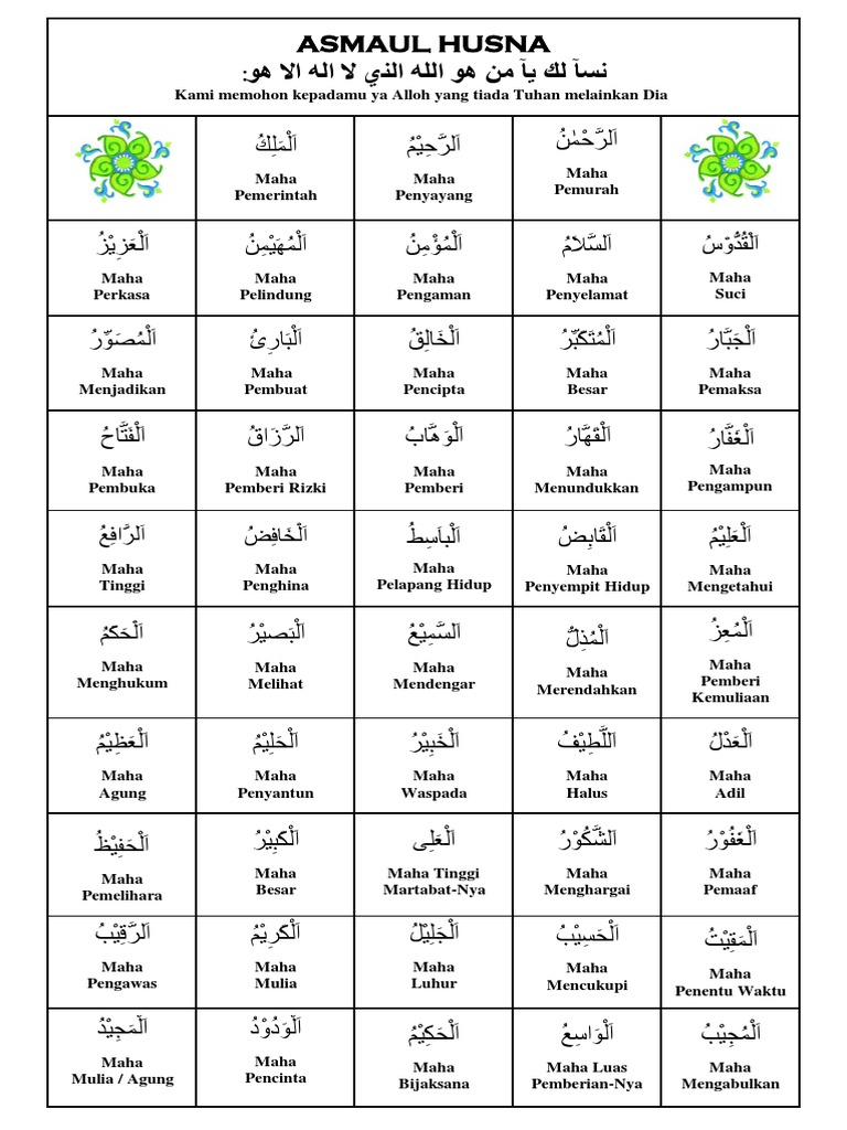 Asmaul Husna Dan Maknanya from i0.wp.com Jan 31, 2018 · we as a muslims believe that the asmaul husna have so many benefits for us. Asma berarti nama dan husna berarti yang baik atau yang indah, jadi asma'ul husna adalah nama nama milik allah yang baik juga indah yang berjumlah 99. Asmaul husna memang sangat tepat sekali dan sangat layak dimiliki oleh allah swt. Download اﻷﺳ َﻤ ُﺎء ا ْﻟ ُﺤ ْﺴﻨَﻰ ْ ِﺬ ْي ﻻ إِﻟَﻪَ إِﻻ ُﻫ َﻮ اَﻟ اﷲ. 99 names of allah (al asma ul husna) the first pillar of imaan (faith) in islam is belief in allah. Manufacturer of digital islamic gadgets and products like digital quran, islamic ipad. Umat islam sangat dianjurkan membaca bahkan menghapal asmaul husna agar hidup selalu berkah dan terlindungi. Apr 09, 2021 · pengertian asmaul husna.